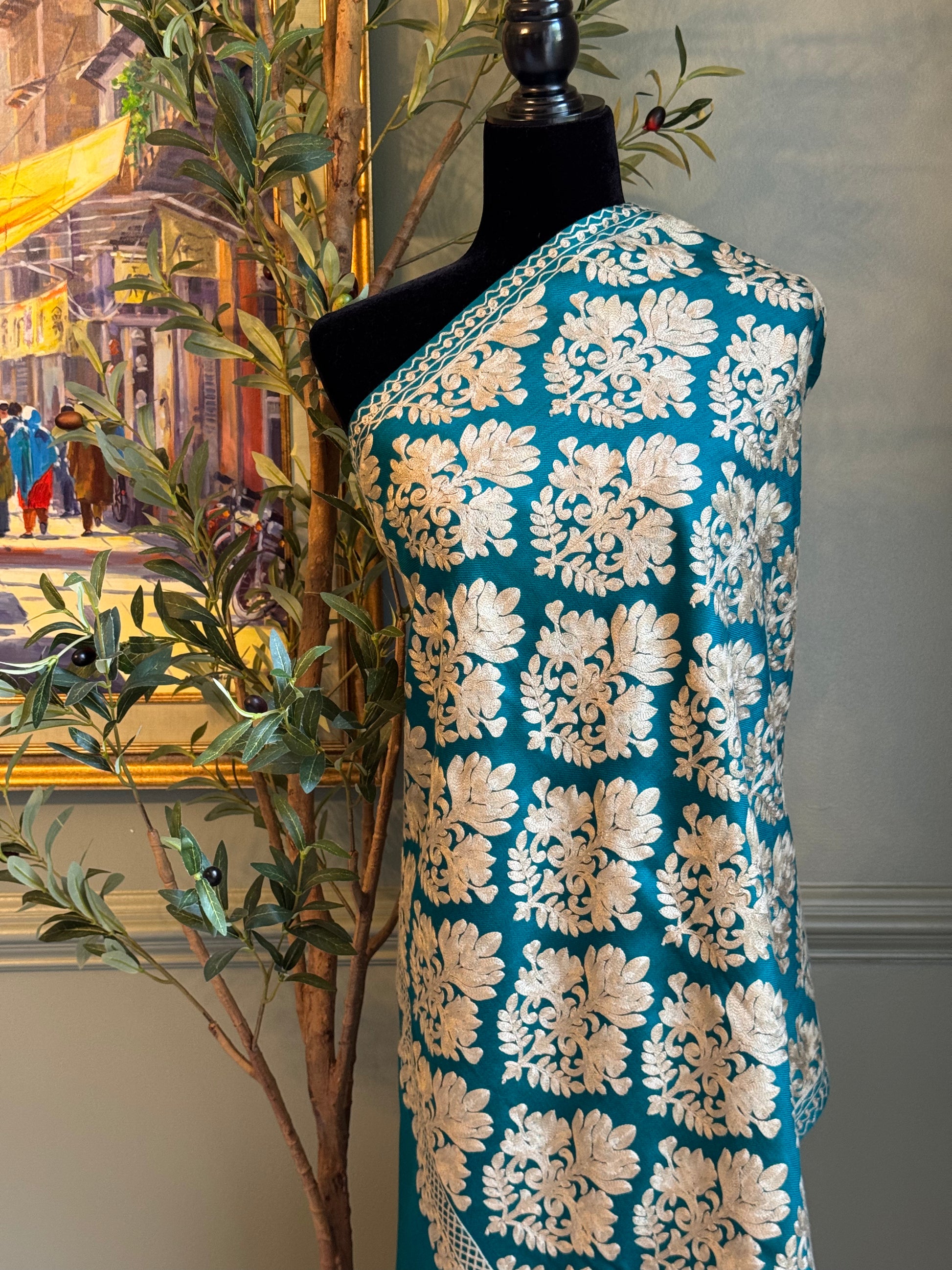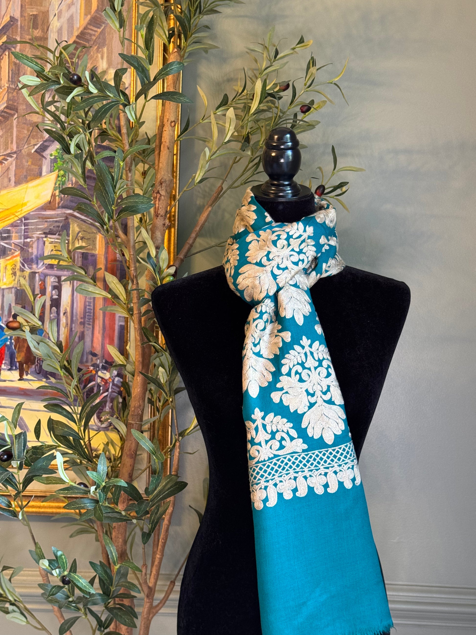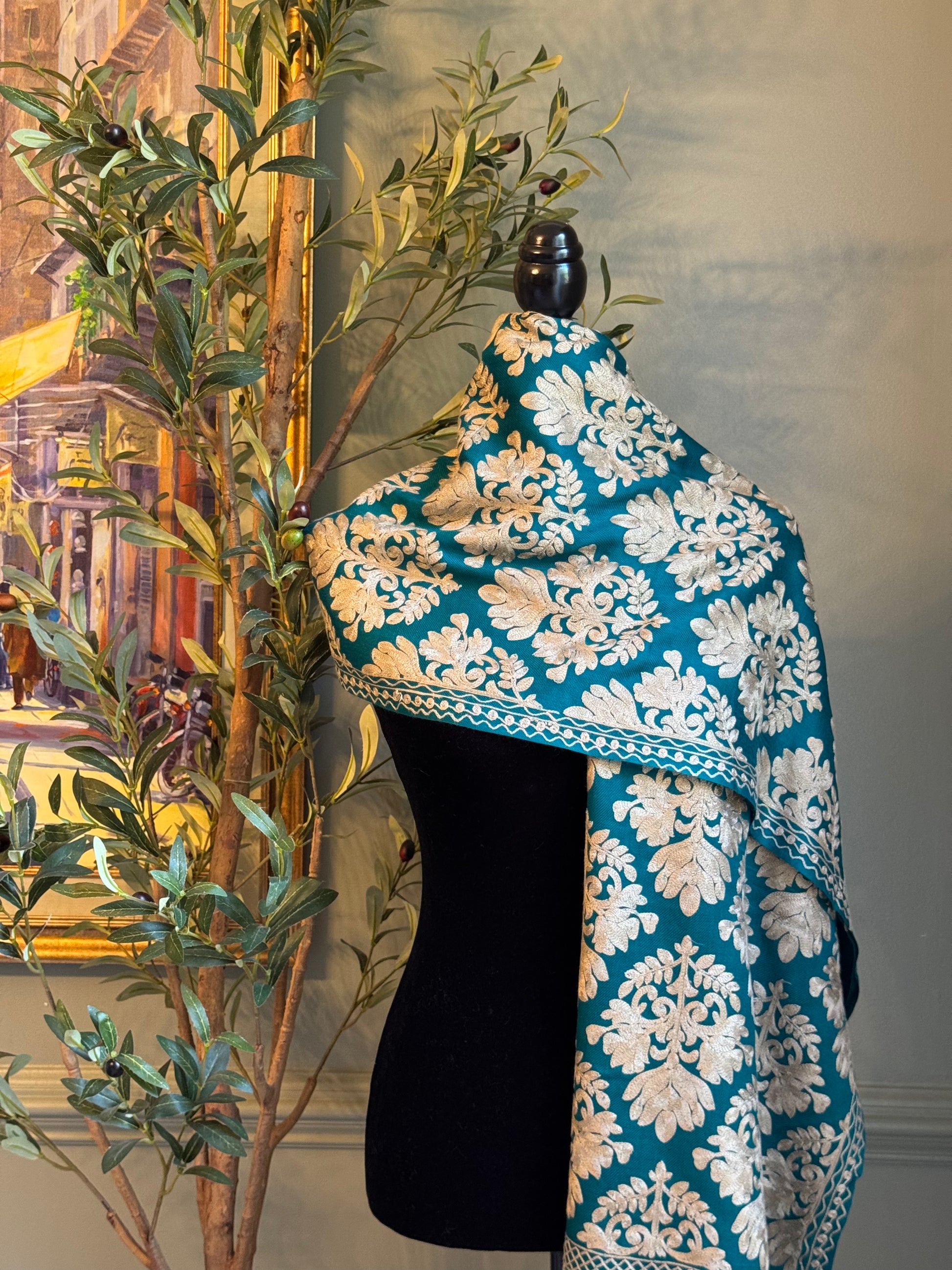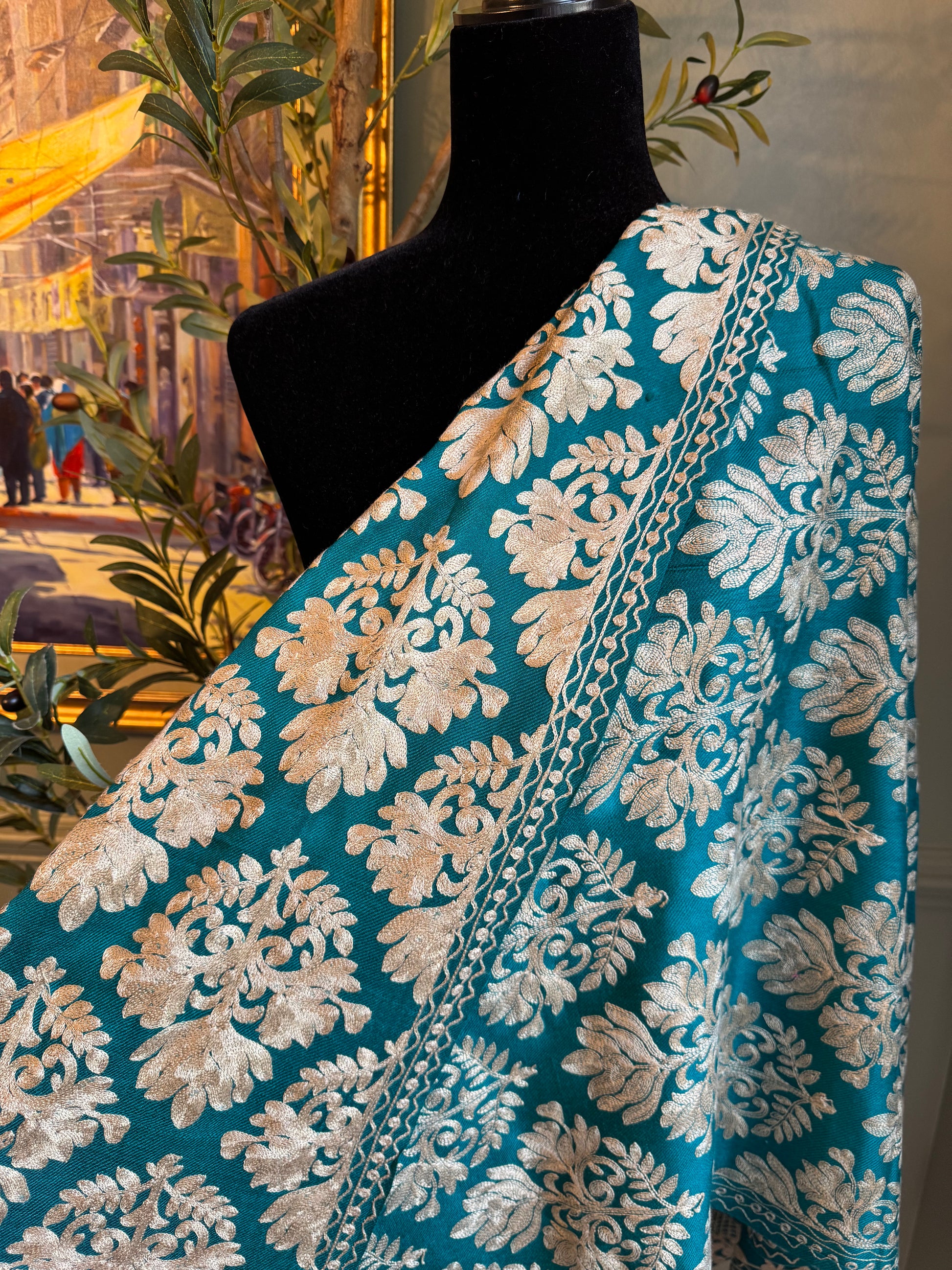 This soft, lightweight shawl features elegant embroidery and a vibrant, reversible design. The touch of gold adds a luxurious feel, making it a stylish accessory for any occasion.