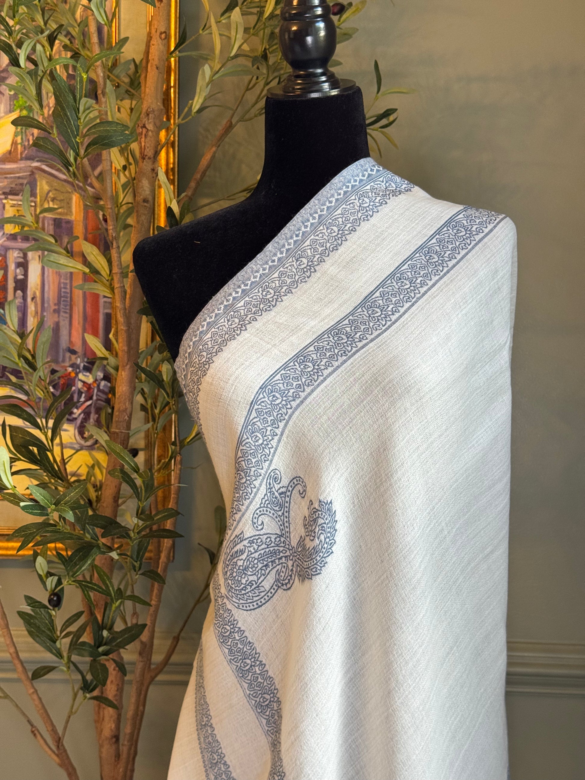 Made from premium wool, this beige shawl offers exceptional softness and a lightweight feel. Its versatile design suits all seasons, making it an ideal complement to any outfit with a touch of elegance and style. Woven on a royal loom with a simply stunning appearance, this shawl is an essential addition to your wardrobe.