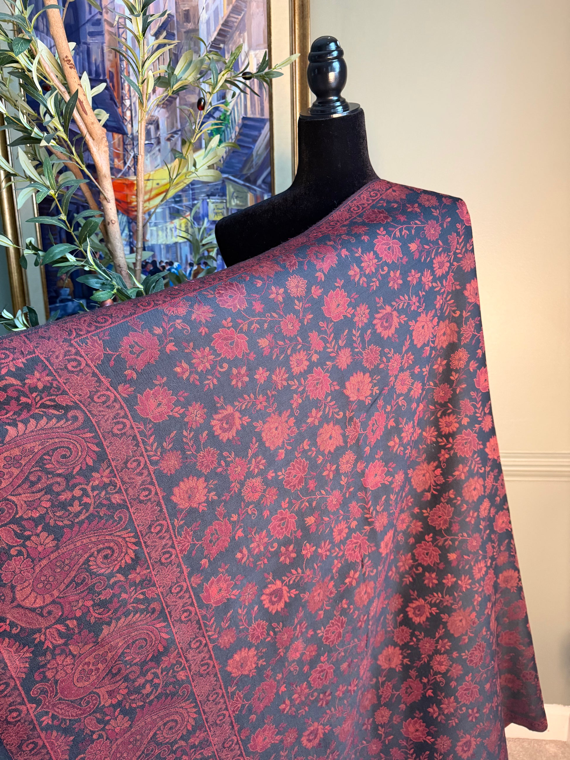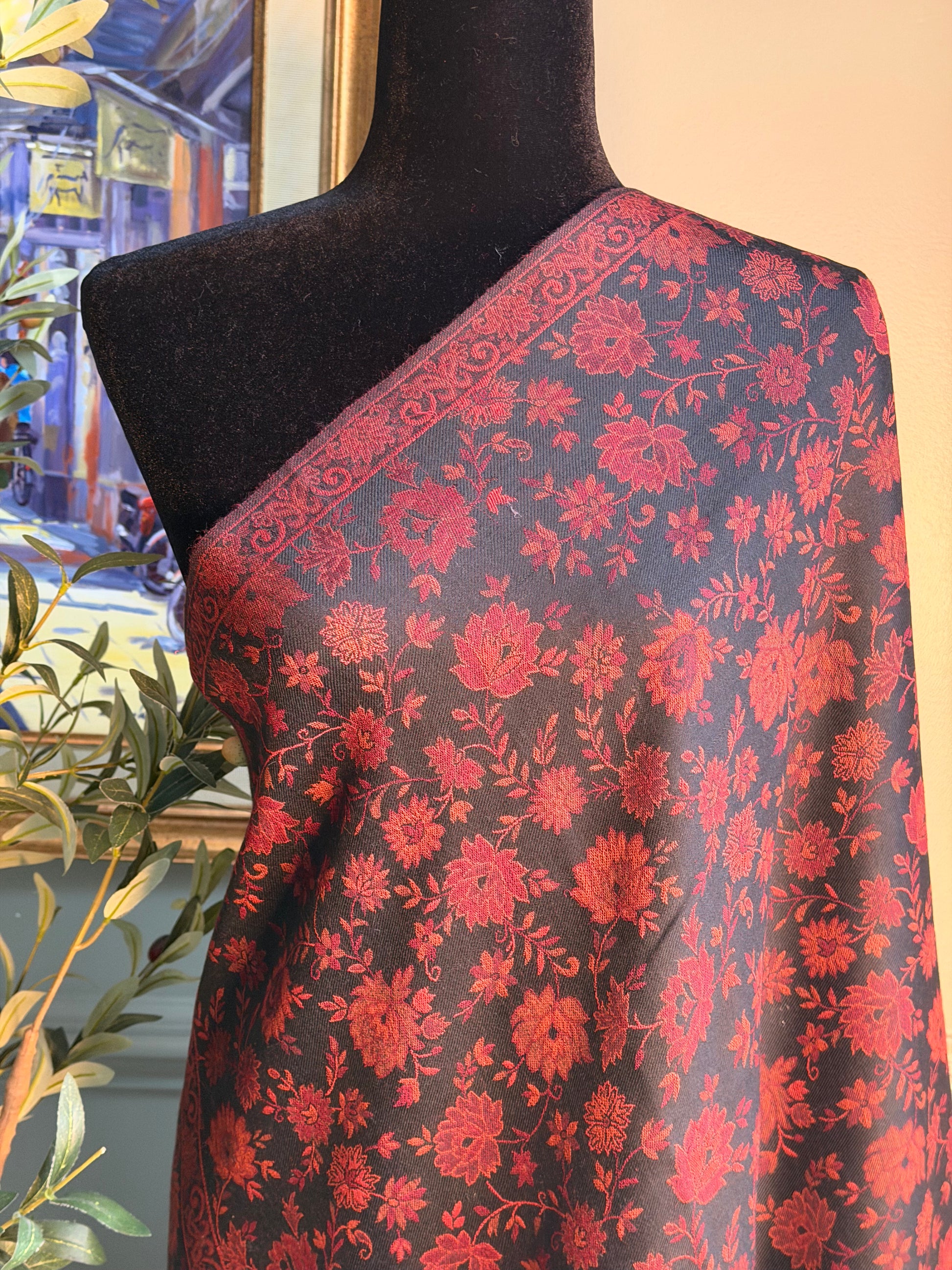 Crimson Royale is a luxurious Black and red woolen shawl with intricate kani work. This elegant wrap provides warmth and sophistication for any occasion.