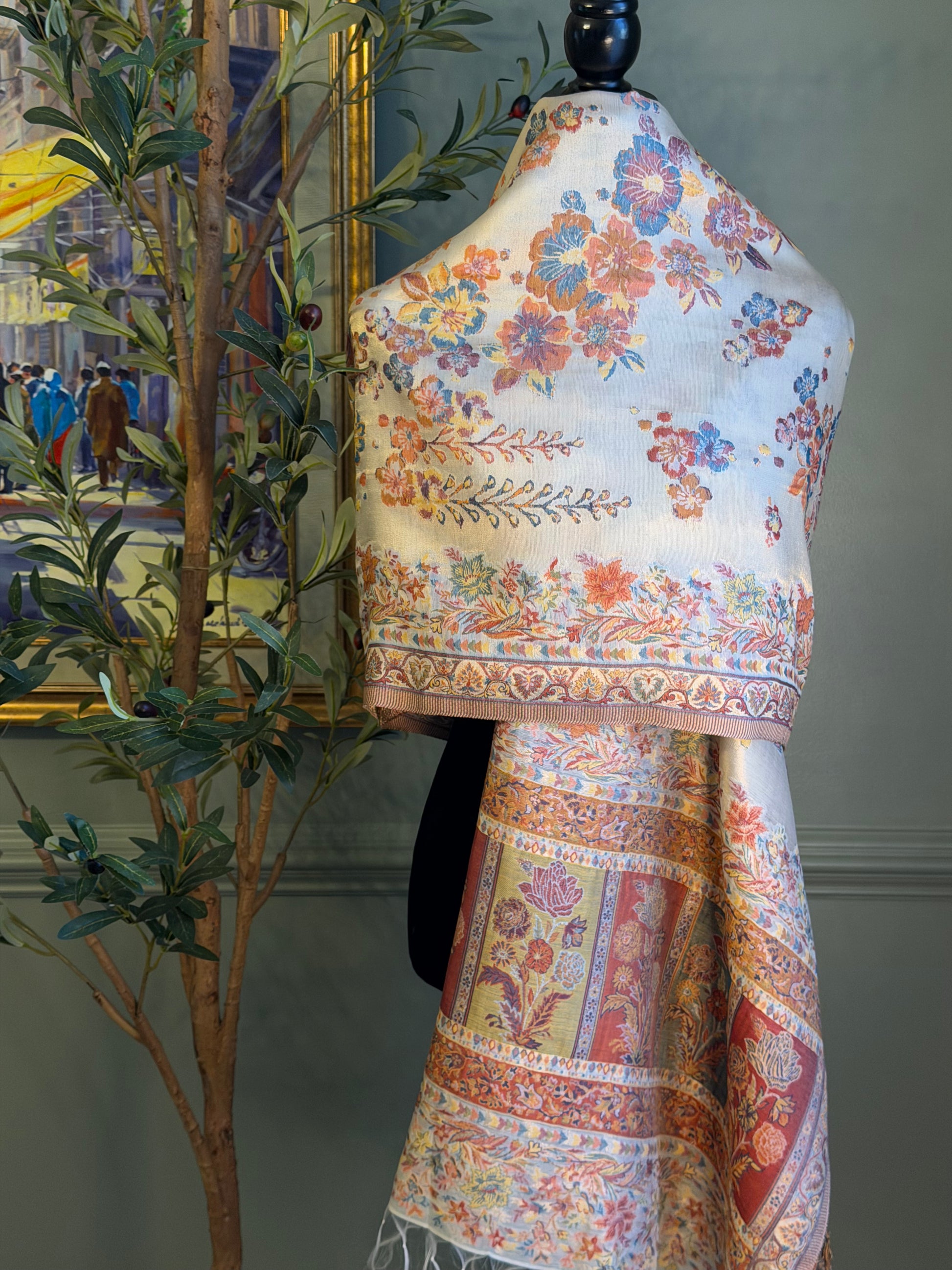 Luxurious silk shawl adorned with intricate gold floral embroidery and delicate tassels. Perfect for weddings and special occasions, this premium piece drapes elegantly and adds timeless sophistication to any ensemble.