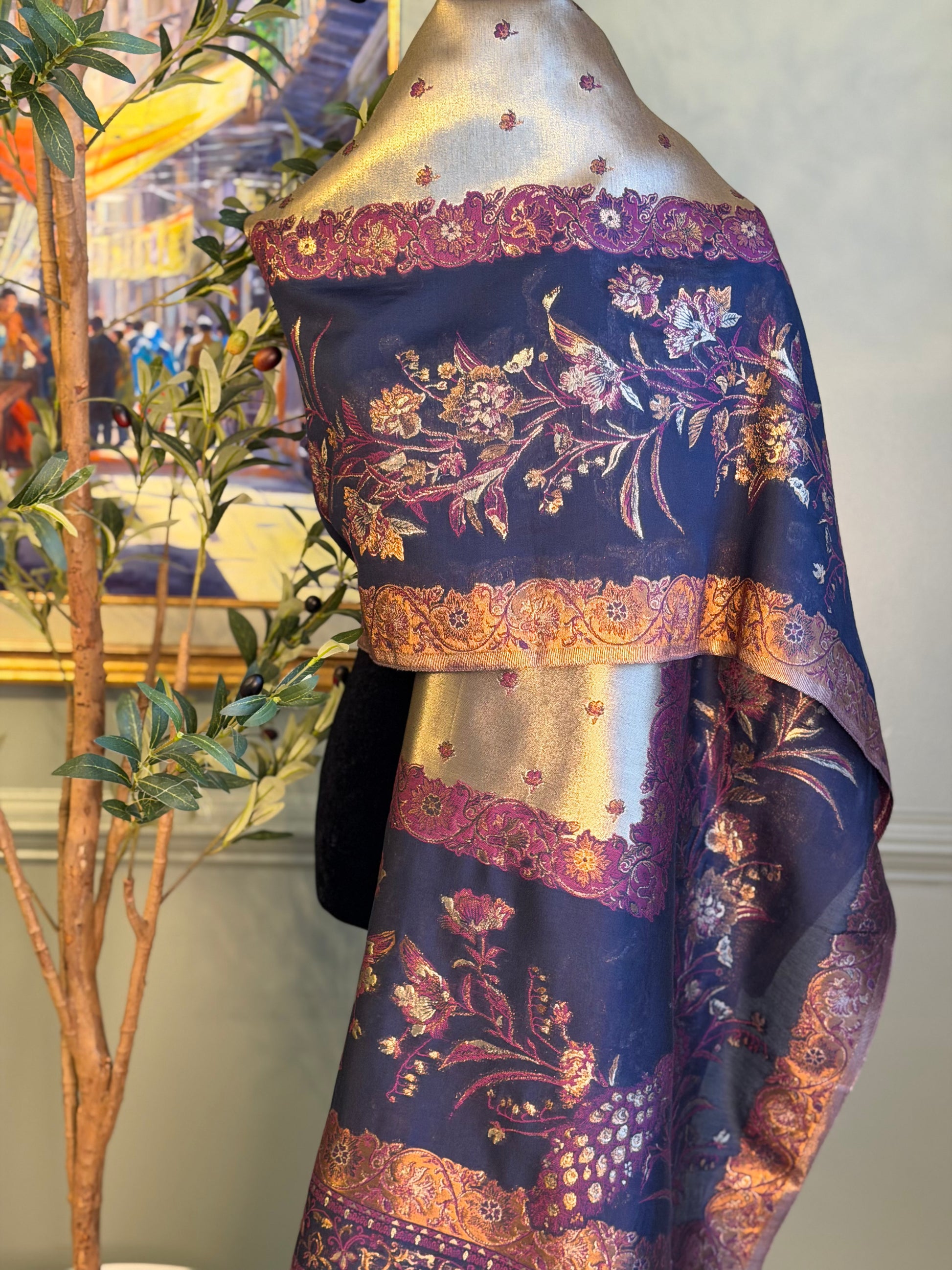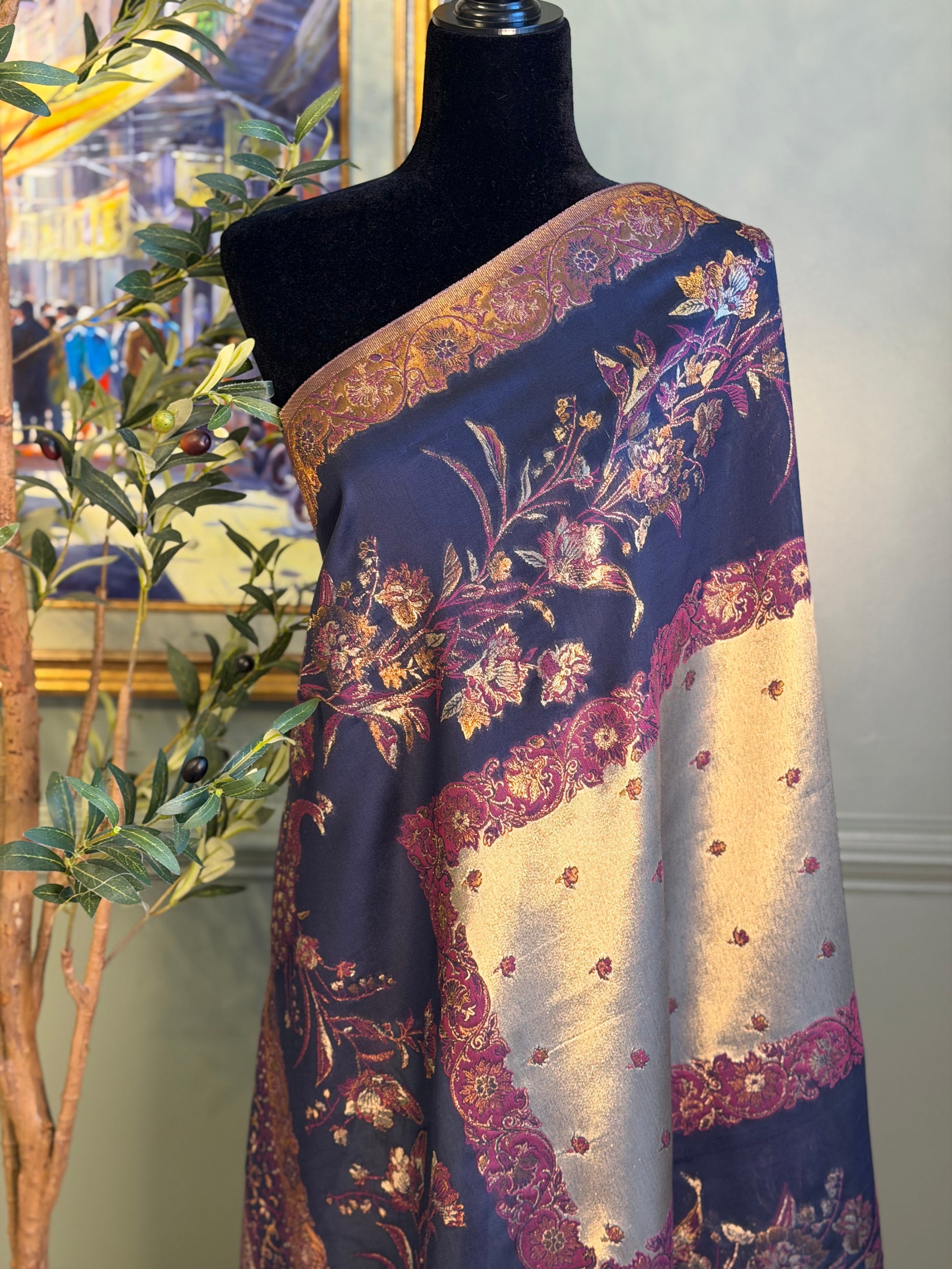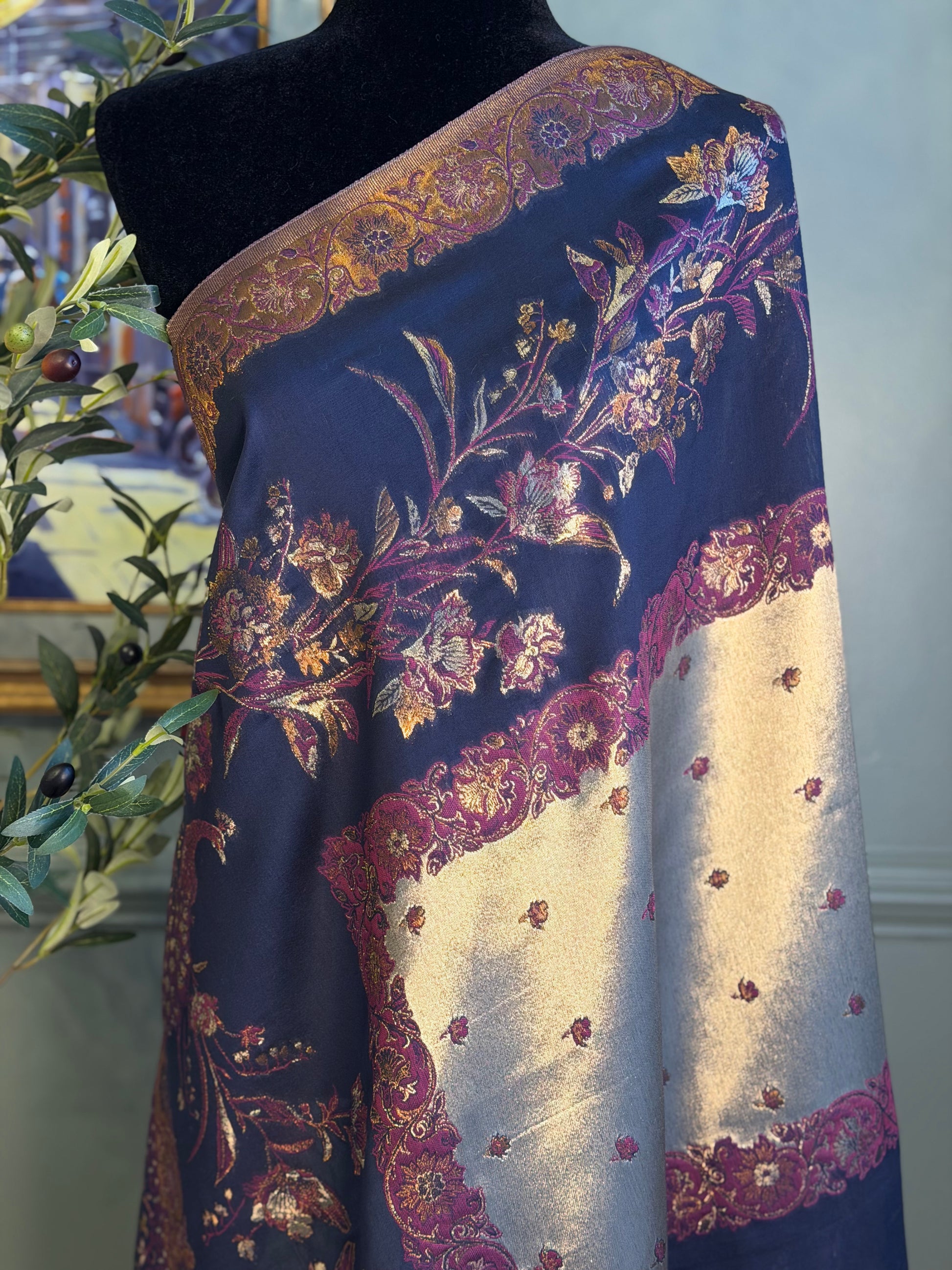 Midnight Radiance features royal silk with intricate Kani foral designs. This elegant piece brings timeless sophistication to any occasion, combining traditional craftsmanship with luxurious materials to elevate your outfit effortlessly.
