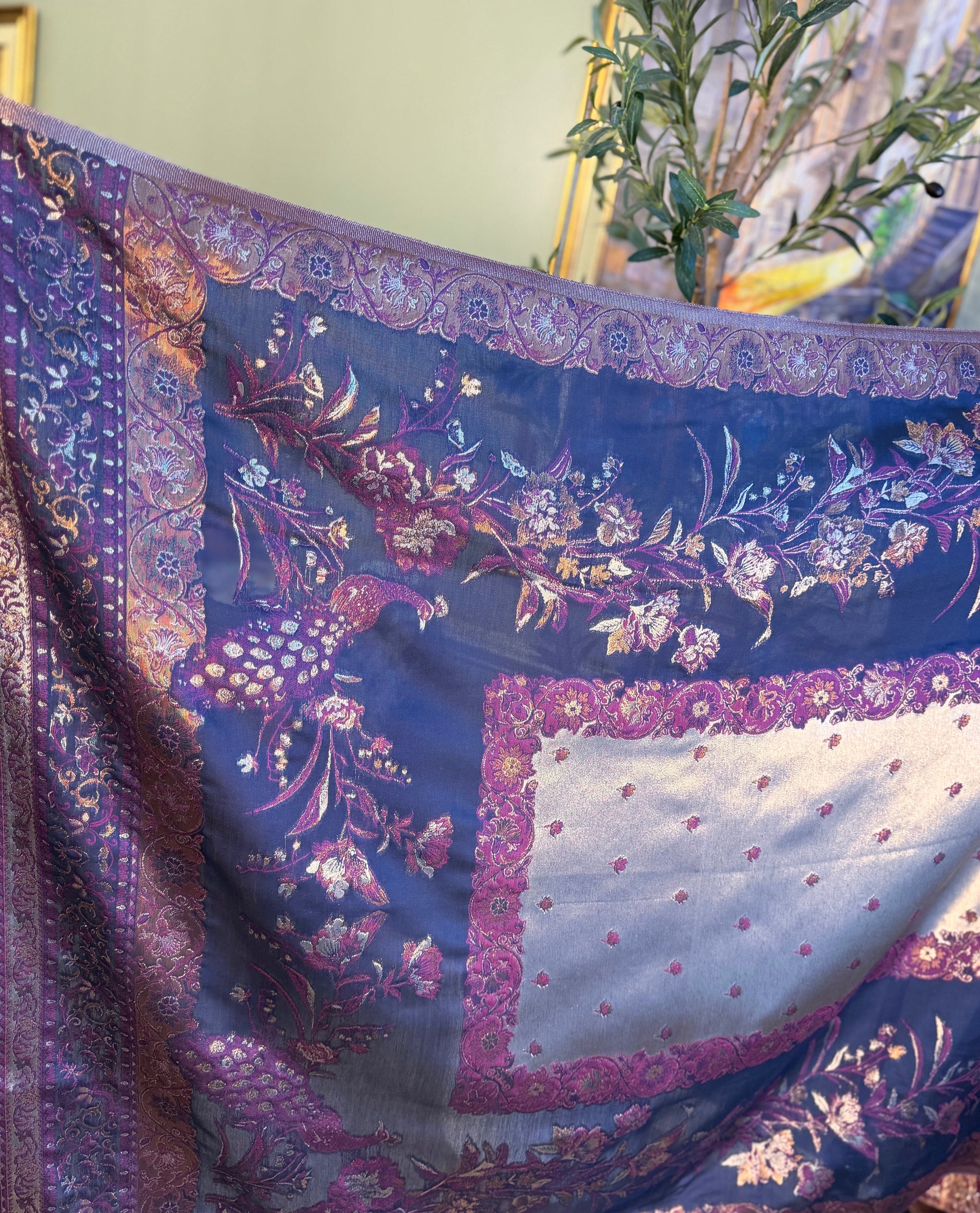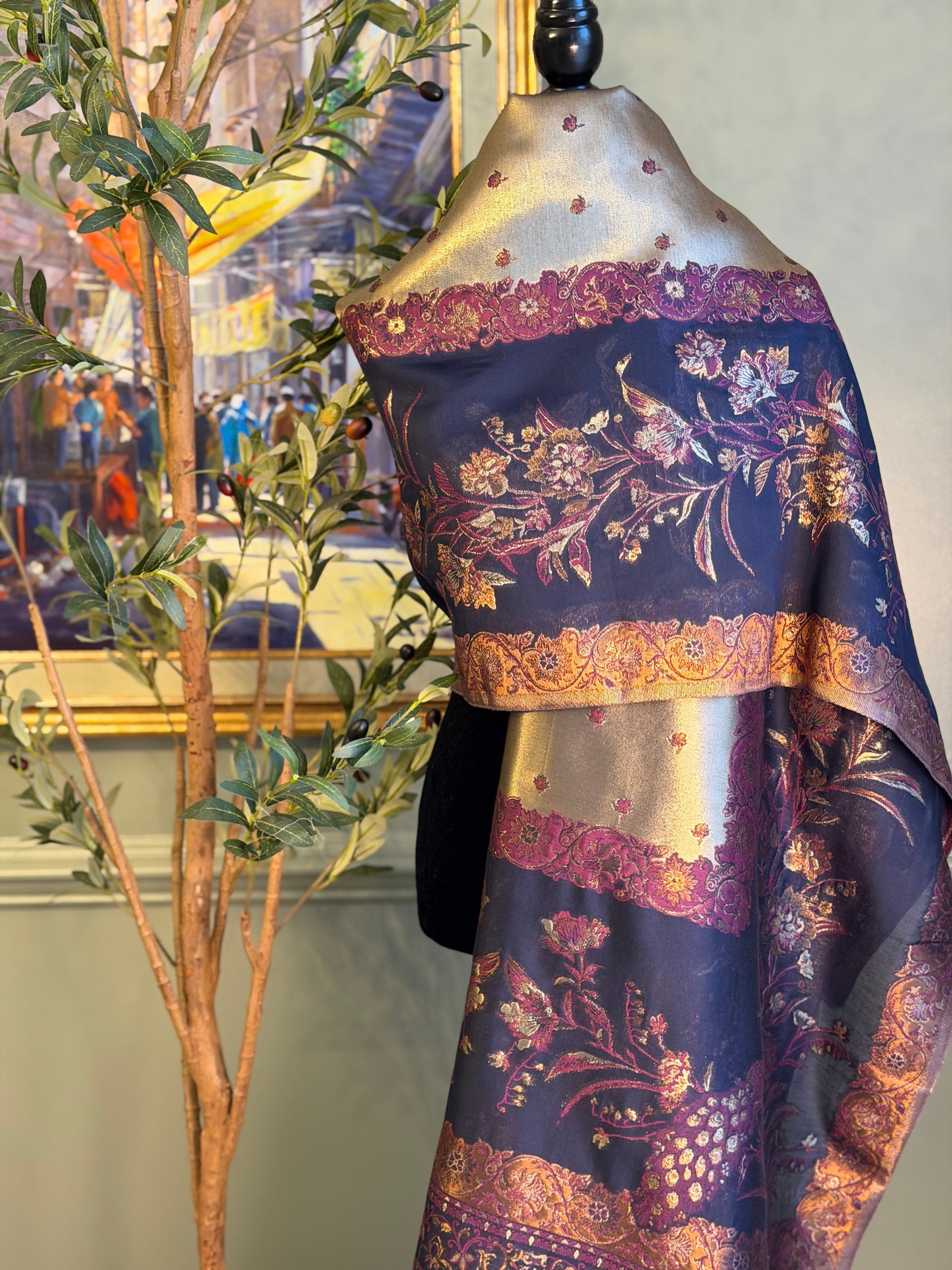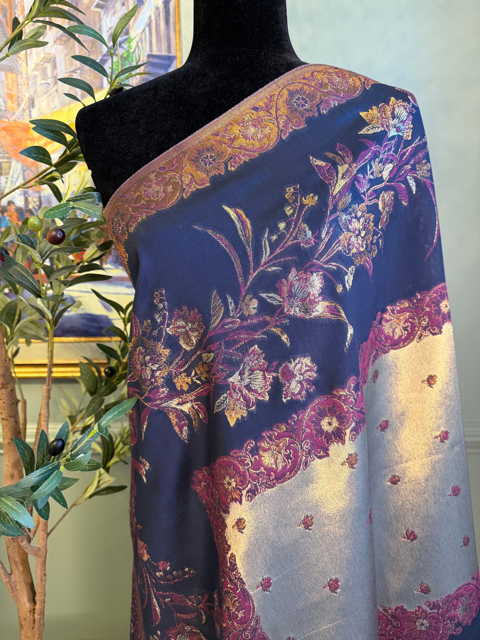 Midnight Radiance features royal silk with intricate Kani foral designs. This elegant piece brings timeless sophistication to any occasion, combining traditional craftsmanship with luxurious materials to elevate your outfit effortlessly.