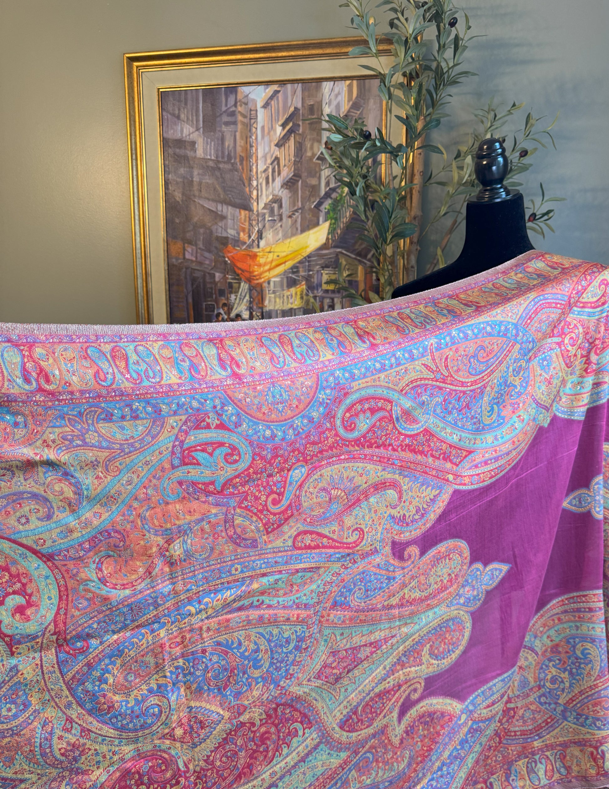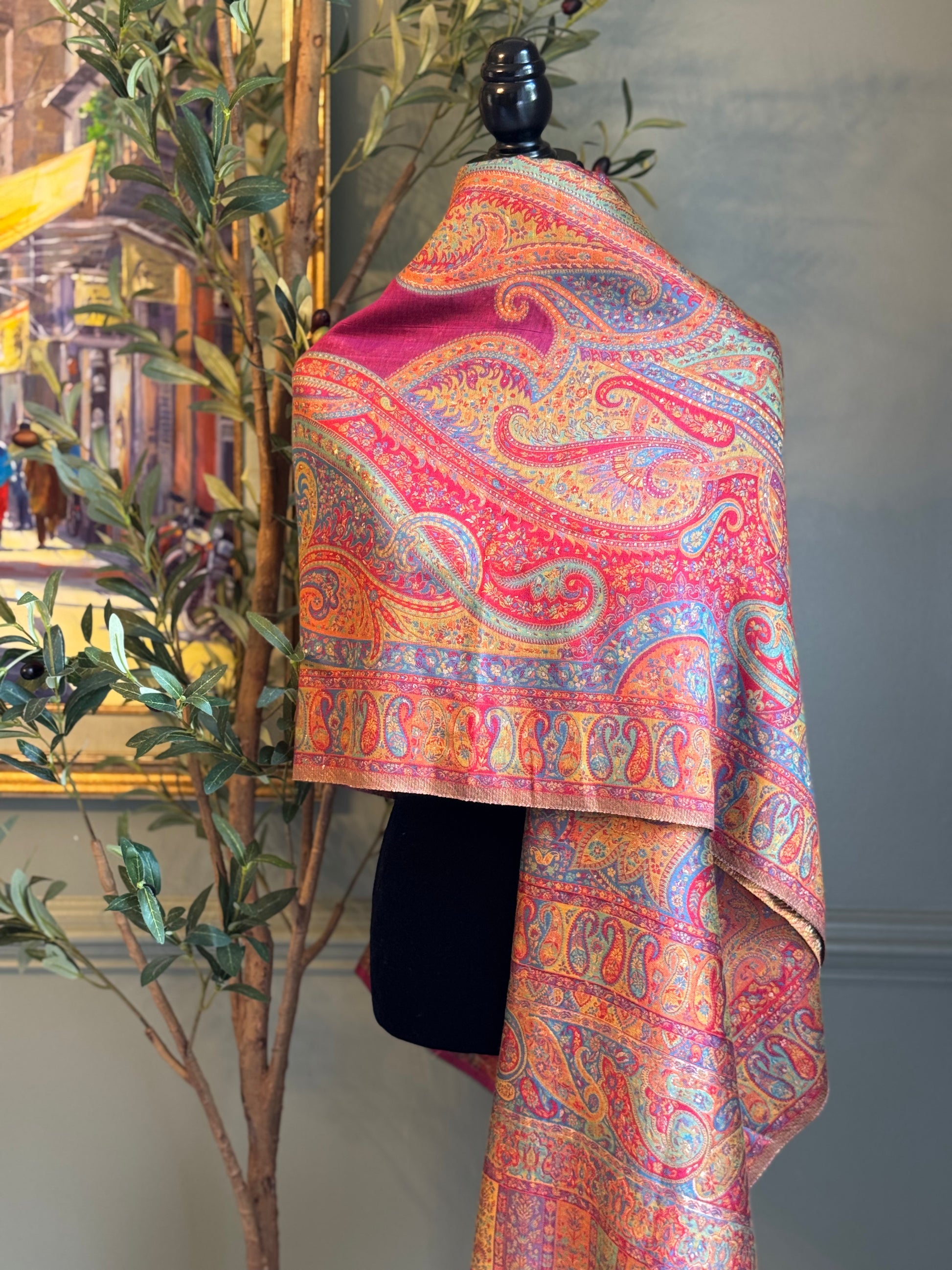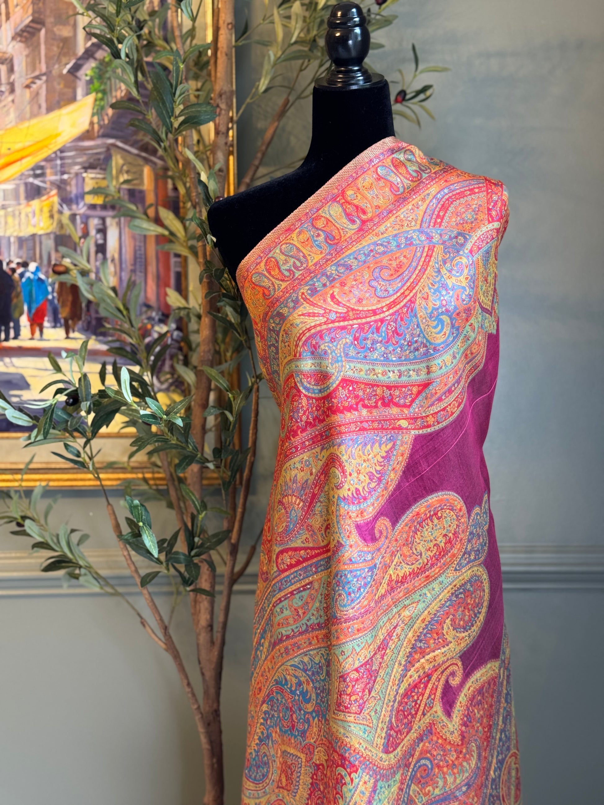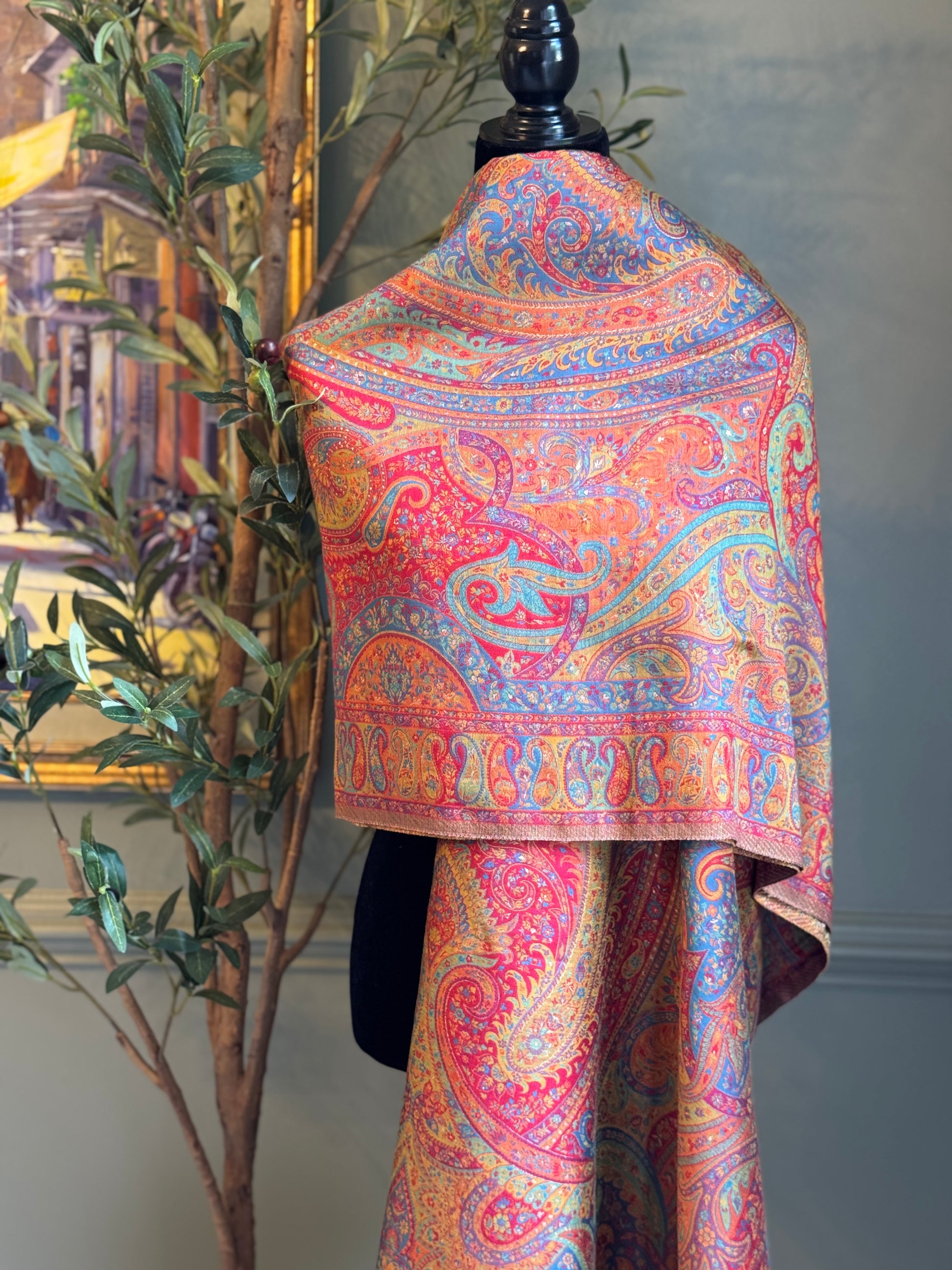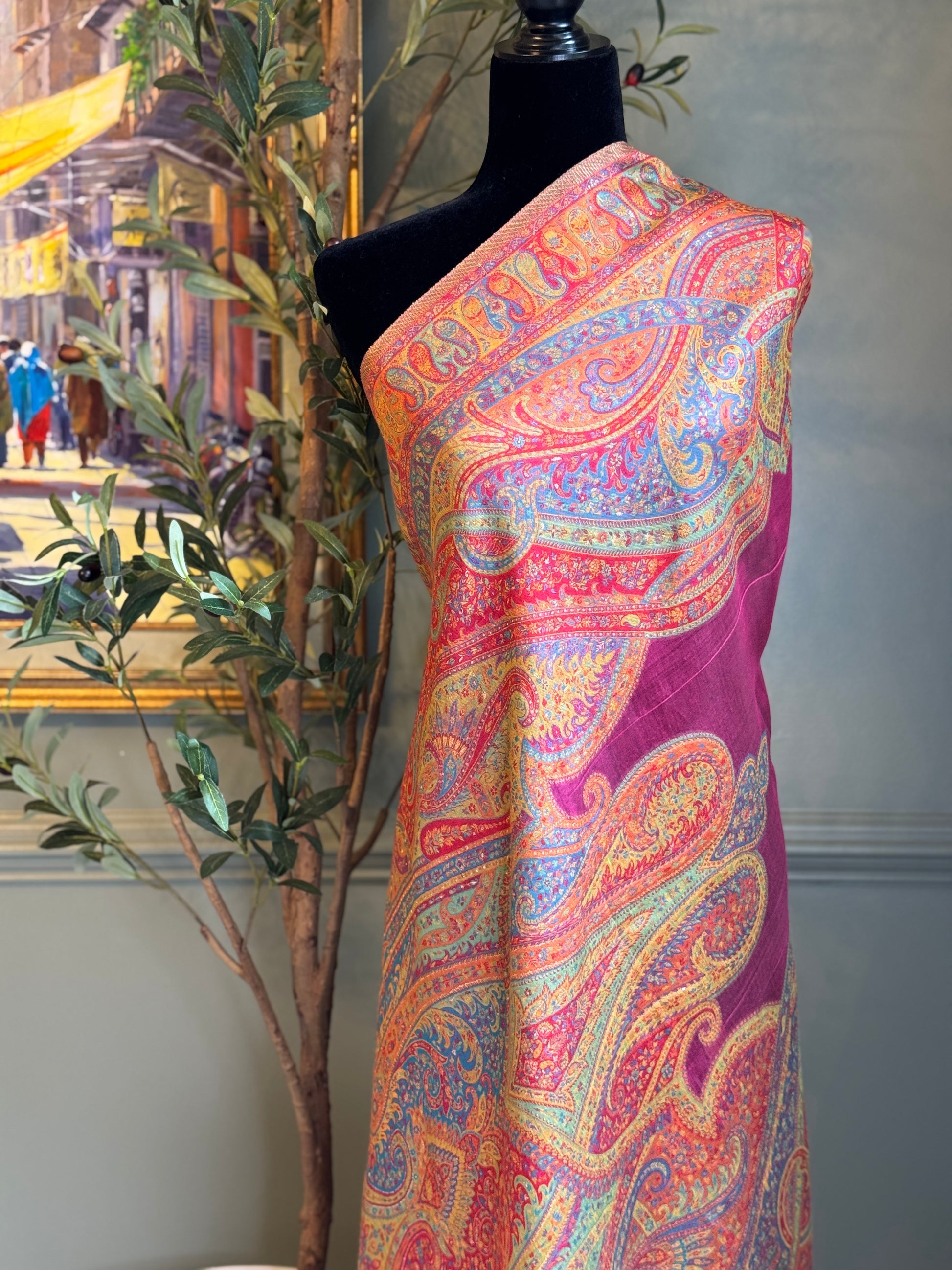 Prismatic Threads is an exquisitely crafted silk shawl featuring fine multi-colored kani embroidery. Its refined design radiates elegance and allure. The soft, sumptuous fabric of Prismatic Threads offers both comfort and sophistication, perfect for adding an element of luxury and beauty to your wedding or special occasion ensemble.