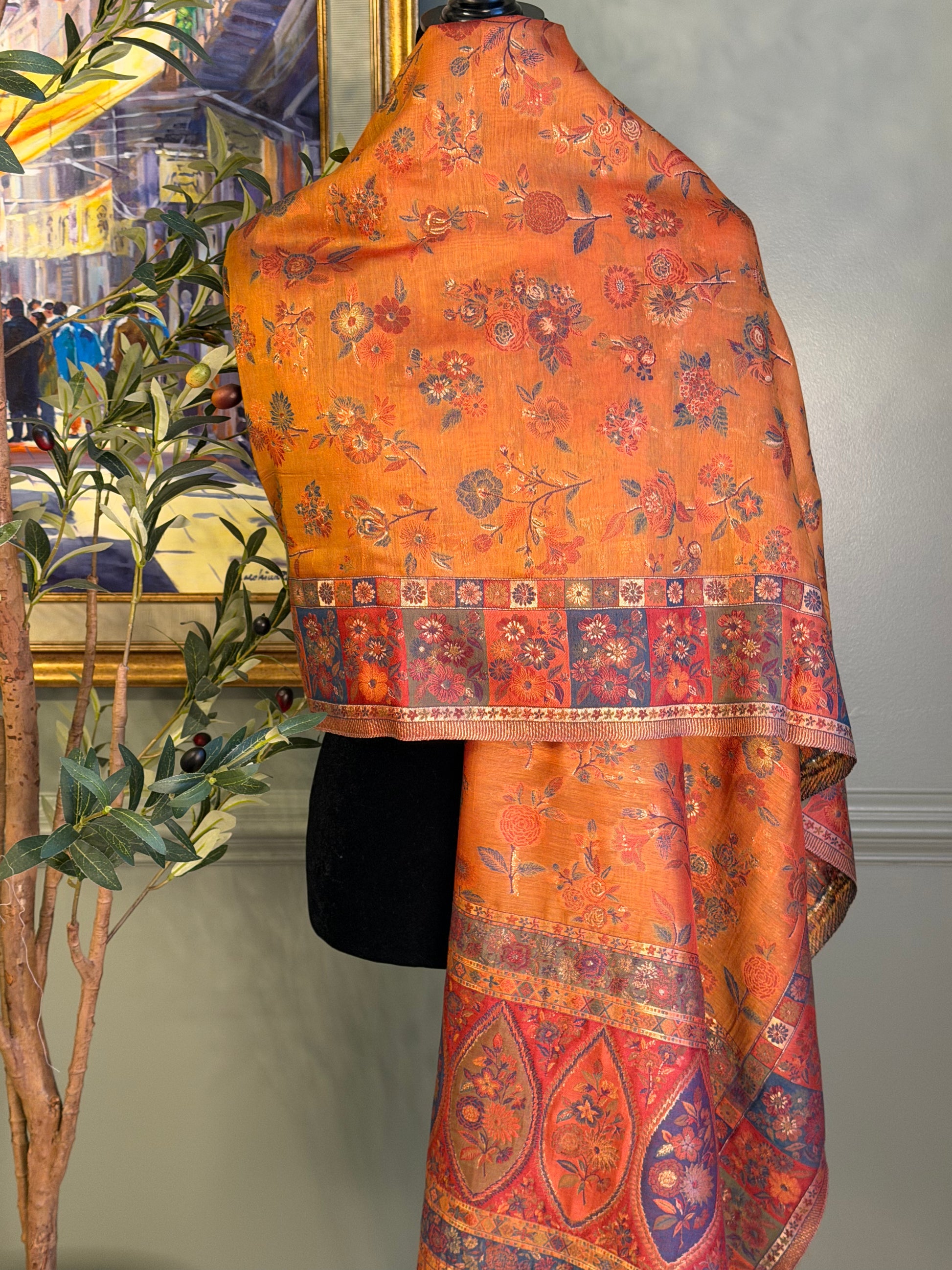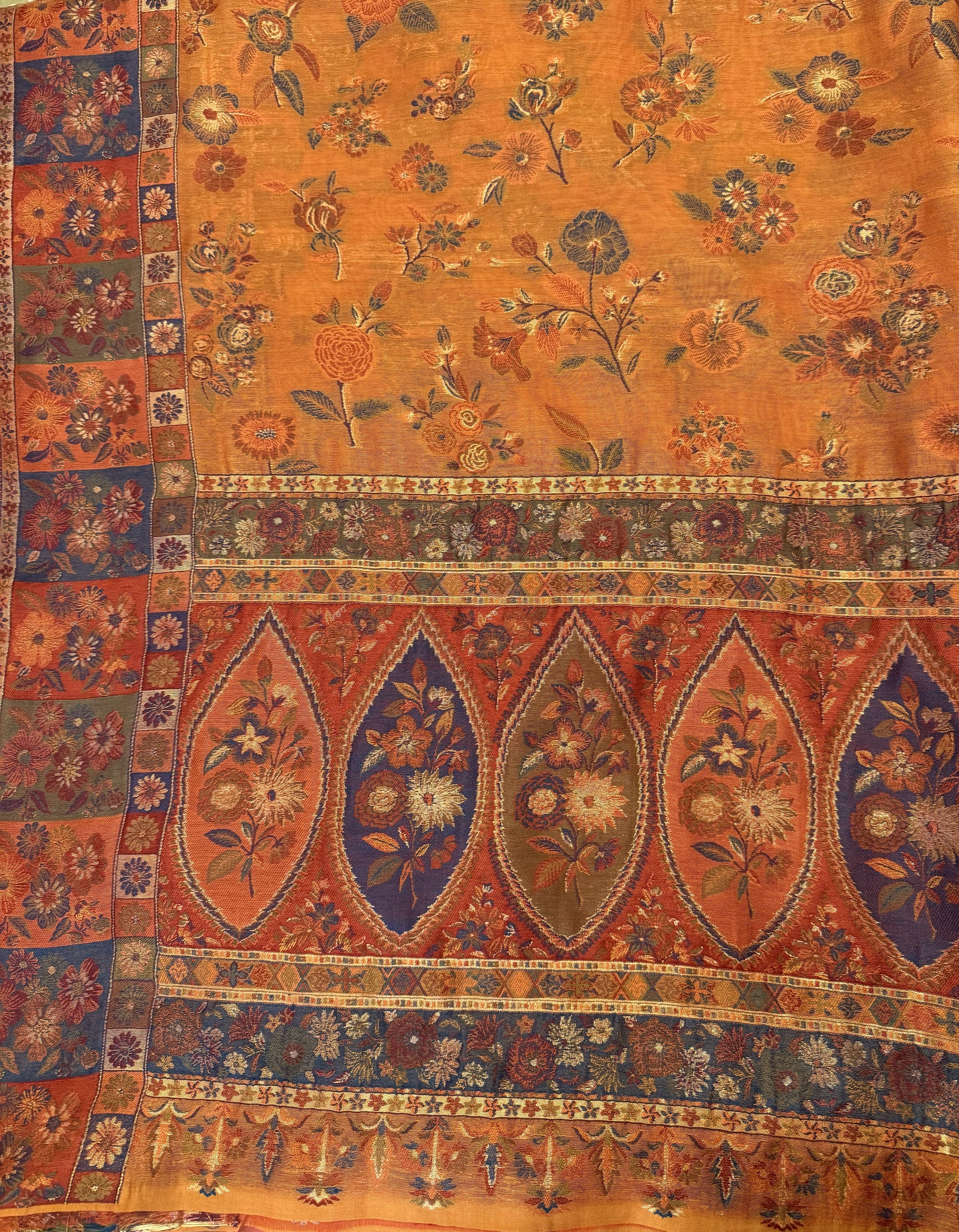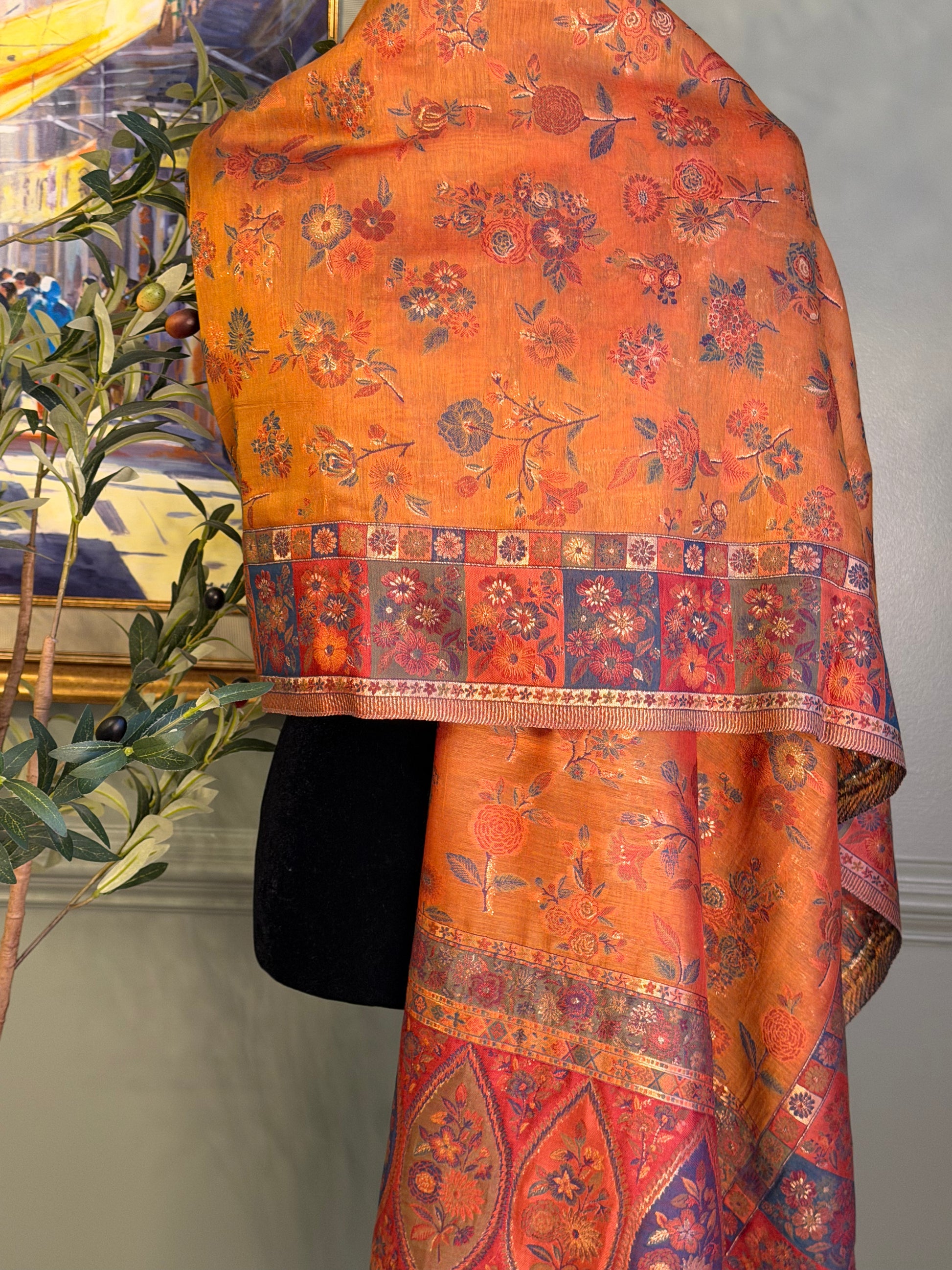 Saffron Meadow features stunning kani floral work in a warm, radiant saffron hue. This elegant piece brings timeless beauty to any special occasion, combining traditional craftsmanship with sophisticated design.
