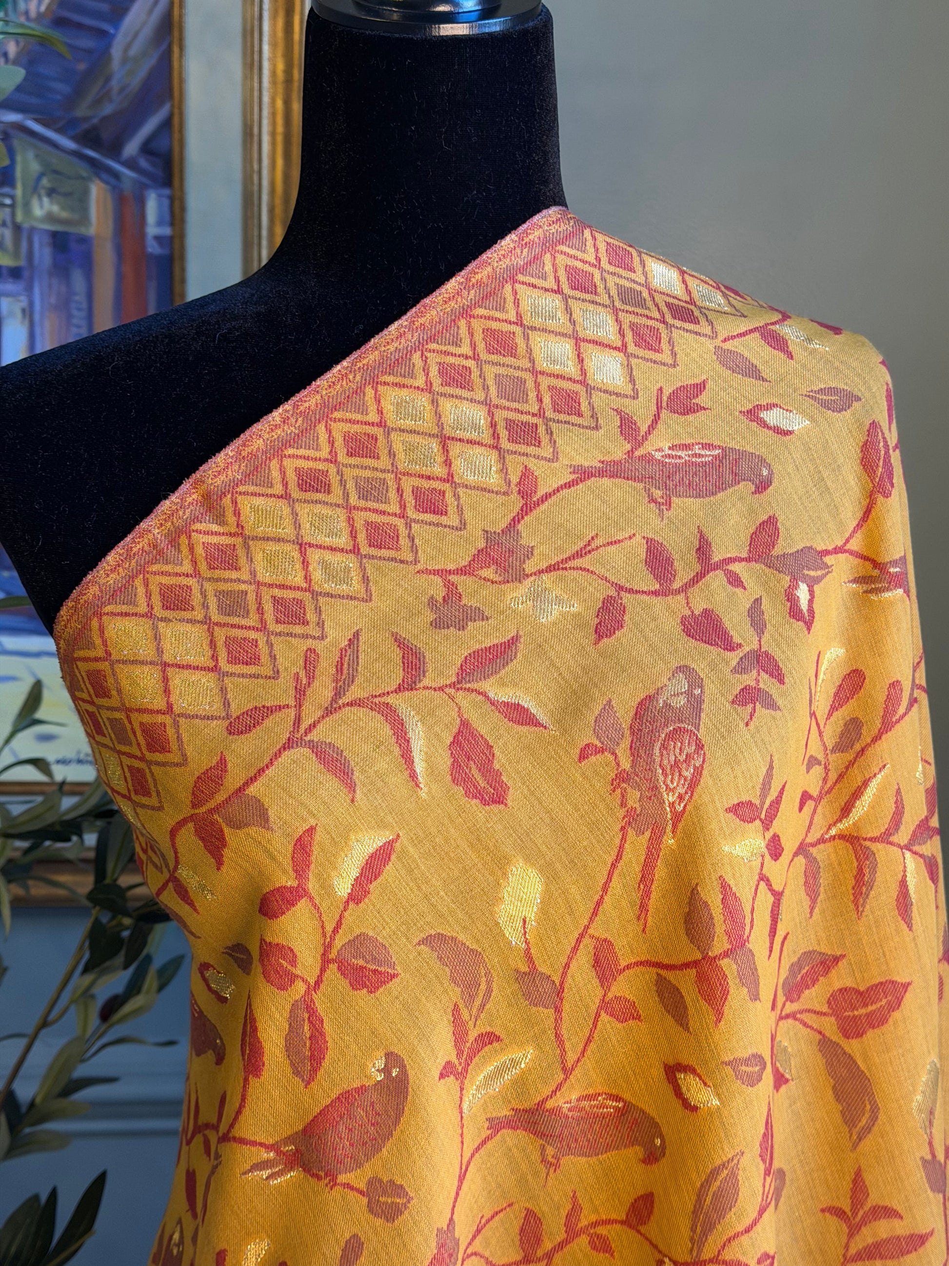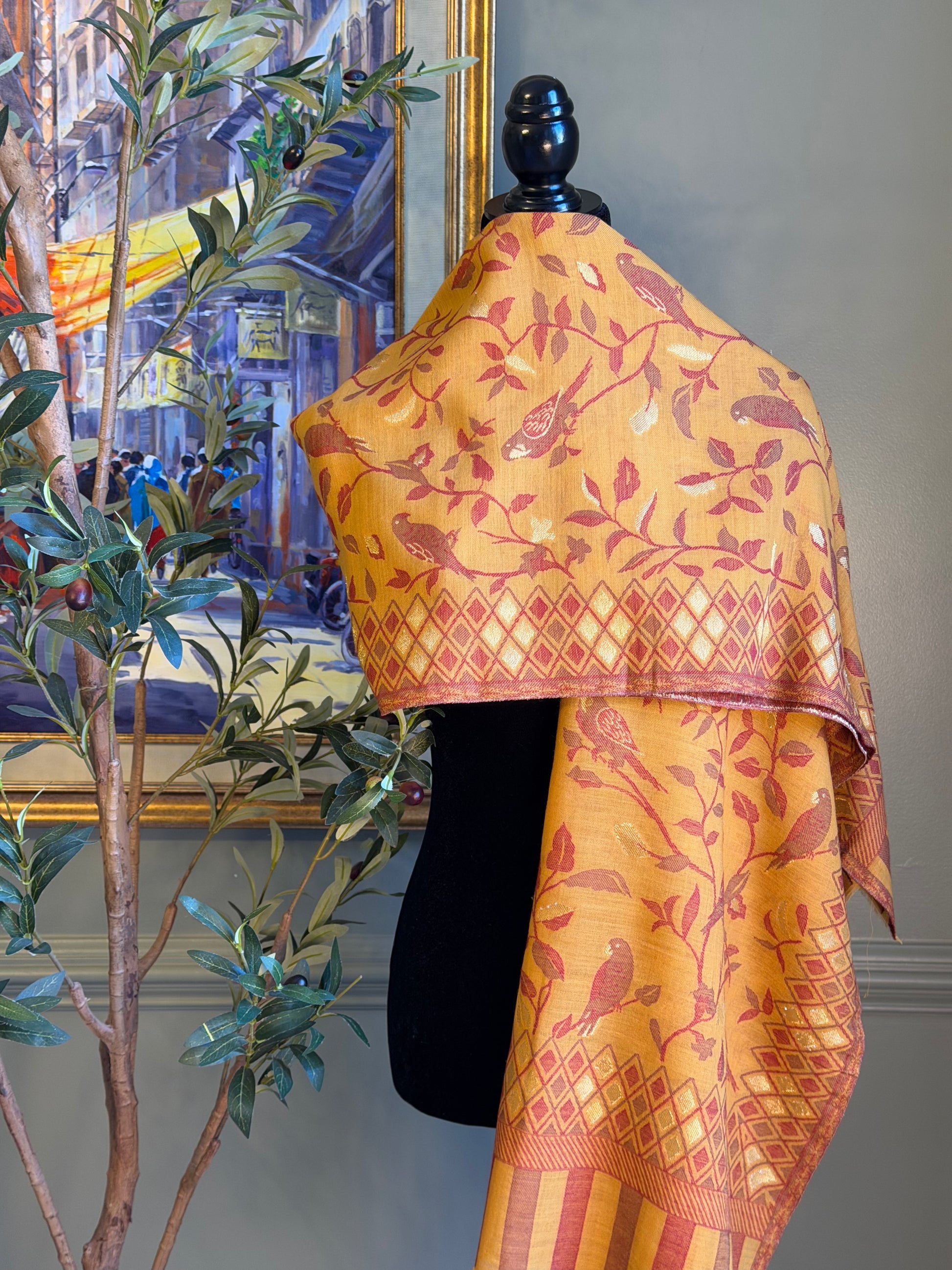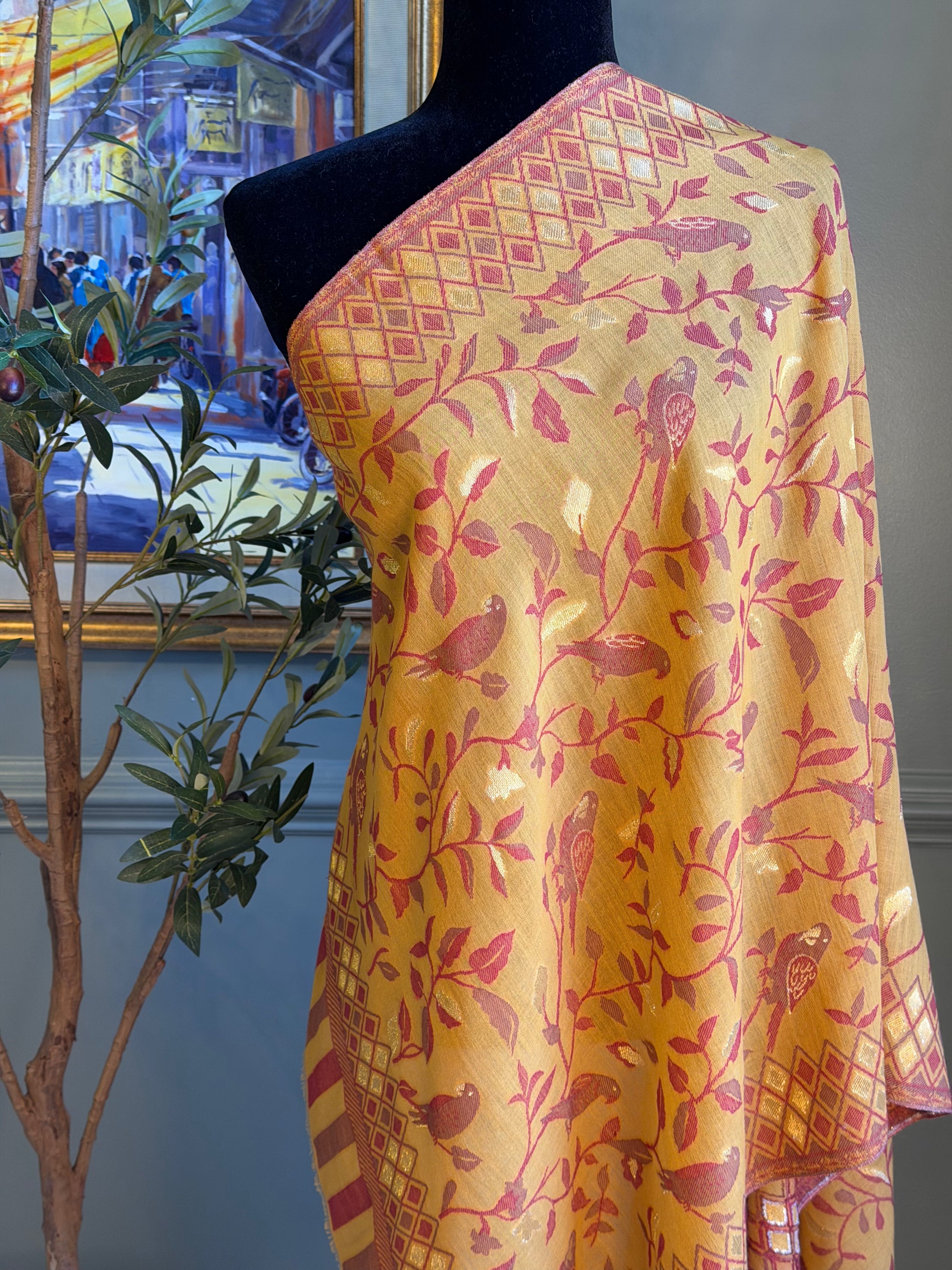 Elevate your everyday with this stunning wool Kani shawl, adorned with intricate bird motifs that bring timeless elegance to any outfit. The vibrant yellow hues instantly brighten your look while the luxurious wool fabric ensures comfort and sophistication. A refined piece that effortlessly combines style with warmth.